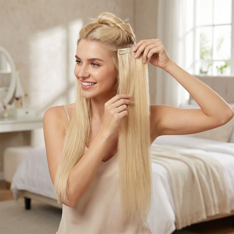 Remy-hår betyr at alle hårstrå og skjellag vender i samme retning, akkurat som ditt eget hår. Dette sikrer at forlengelsene blender naturlig inn og ikke floker seg. Den lyse #613 Blond-fargen passer perfekt for deg som ønsker en lys og strålende look. Settet består av totalt 7 baner, noe som gjør det enkelt å feste og ta av for en rask stilforandring.
