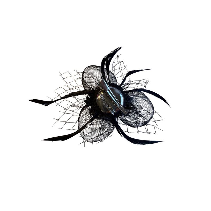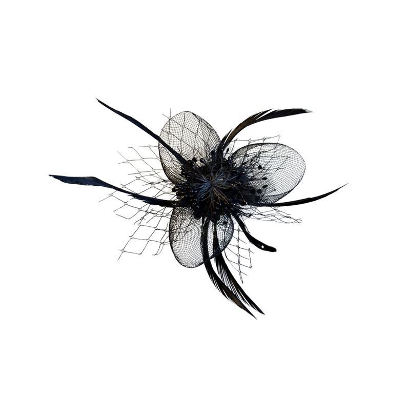 Gi antrekket ditt et sofistikert preg med denne elegante svarte blomsterdekorasjonen som kombinerer feminin sjarm med allsidig funksjon. Designet i sort tyll og pyntet med fine fjær, gir den et eksklusivt uttrykk – perfekt både i håret og på klærne.