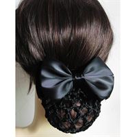 Håret med en sløyfe i sort. Vil du holde knollen på plass mens du pynter frisyren din? Med det smarte hårnettet med sløyfe kan du gjøre begge deler samtidig. Knollen din vil sitte vakkert og den søte sløyfen vil gjøre frisyren vakker å se på.