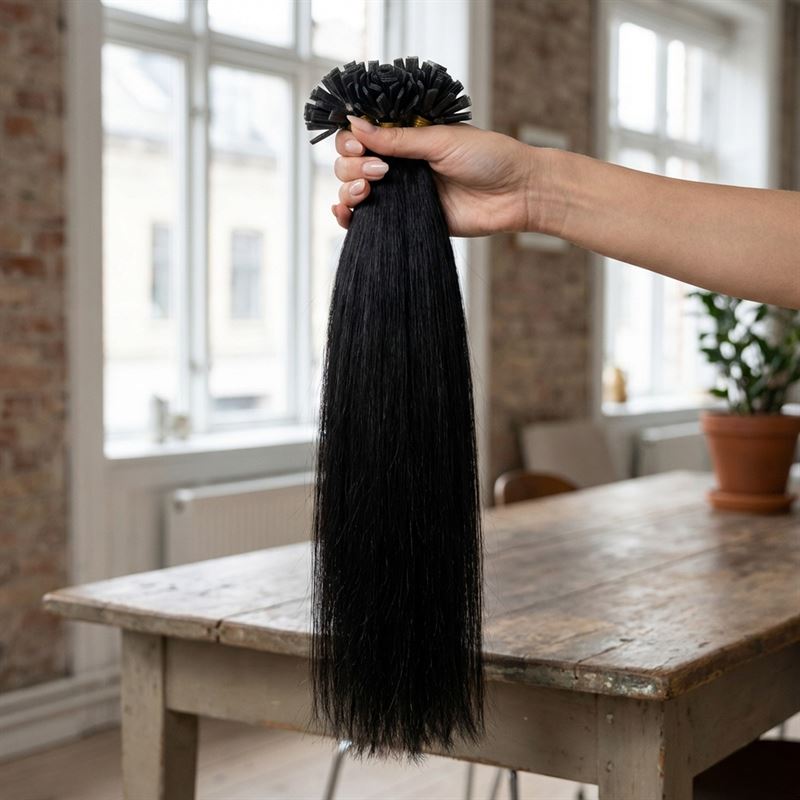 Hver pakke inneholder ca. 100 U-tip extensions, hver på 0,5 gram, totalt 50 gram 100% Remy-hår. Disse extensionsene er utstyrt med negleformet keratinvoks i den ene enden, som smeltes inn i ditt eget hår med en hot fusion connector. Remy-kvaliteten sikrer at alle hårstrå og skjellag vender i samme retning, noe som bidrar til at håret blander seg sømløst med ditt naturlige hår.