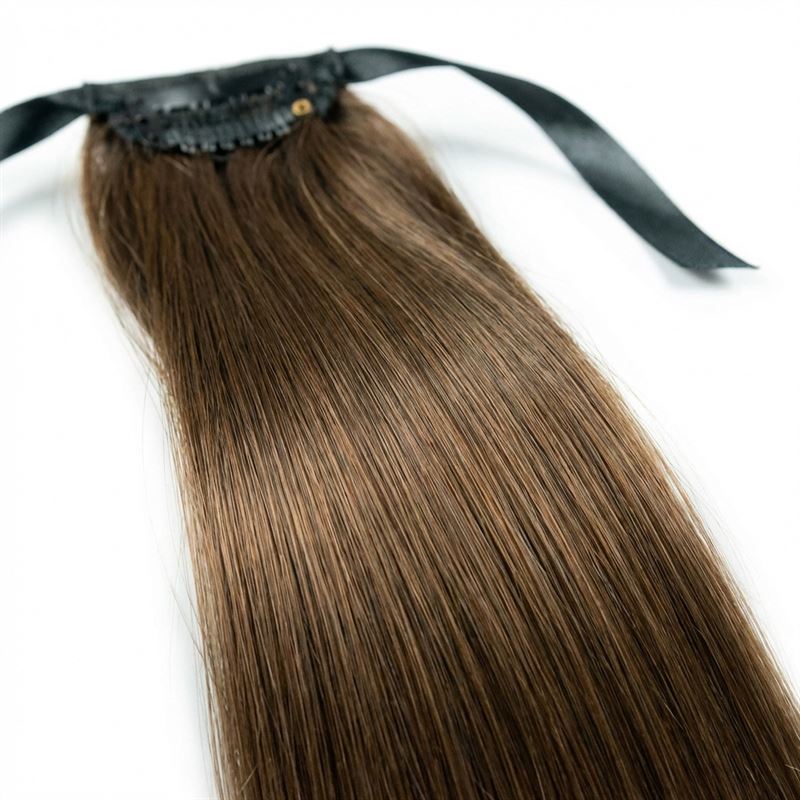 Hestehale-hårforlengelse i fargen 6# Lysebrun med 60 cm lengde på løshåret. Få den fine, lange og fyldige hestehalen du alltid har drømt om med våre hestehale-extensions.