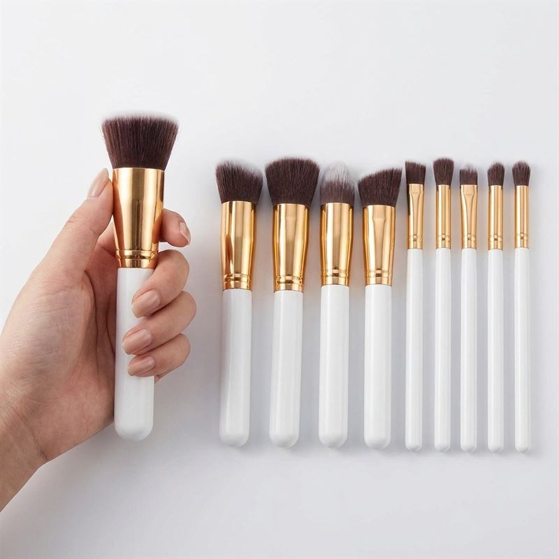Dette PRO sminkekostsettet i hvit og gull inneholder 10 koster, perfekt for å oppnå en feilfri makeup-look. Settet består av 5 presisjonskoster og 5 kabukikoster, designet for å dekke alle dine behov for påføring og blending.