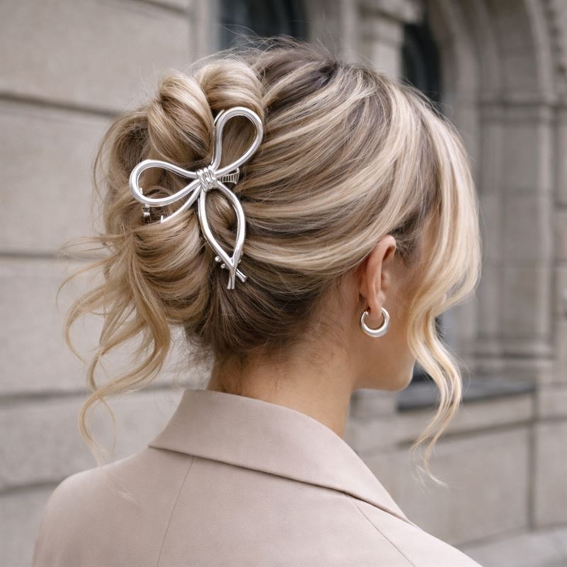 Det åpne sløyfedesignet gir et lett og elegant uttrykk i håret og gjør hårklemmen til mer enn bare et praktisk tilbehør – den fungerer også som en fin detalj som fullfører outfiten din. Den passer både til hverdagsbruk og til de dagene du ønsker at looken skal føles litt mer gjennomført.