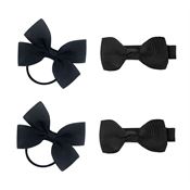 Med dette settet får du to vakre sløyfe hårelastikker på 5 cm, skapt for å gi deg en stilig og behagelig måte å samle håret ditt på. Uansett om det er en klassisk hestehale eller en romantisk knute, vil disse elastikkene holde håret ditt sikkert på plass. Du får også to elegante sløyfe hårspenner på 5,5 x 2,5 cm, som legger til en touch av glamour til frisyren din. Disse hårspennene er perfekte for å feste håret tilbake og skape en sjarmerende look for enhver anledning.