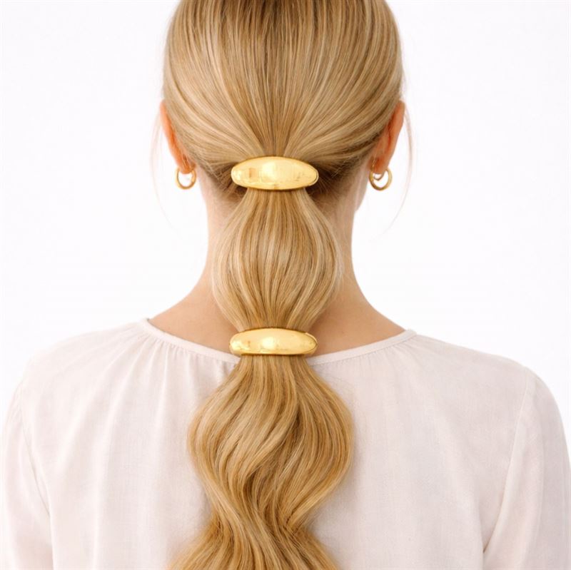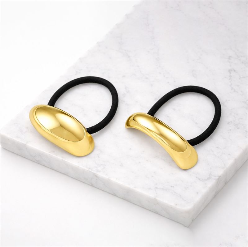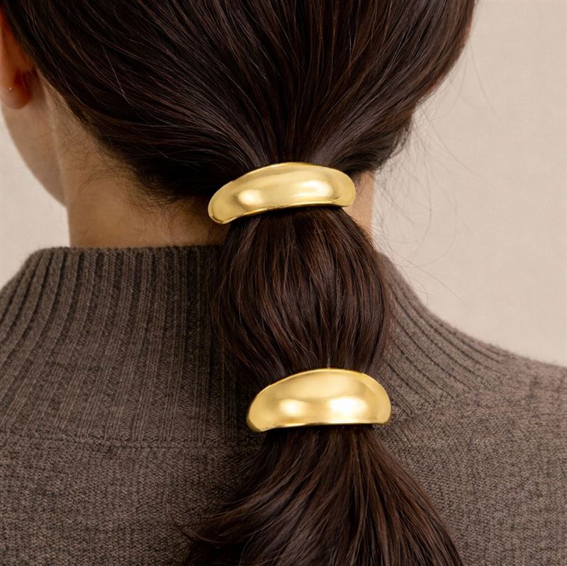 Gi frisyren din et eksklusivt og moderne løft med Nova hårelastikker i gull. Settet inneholder 2 elegante hårelastikker med blanke gullfargede detaljer i to forskjellige former, som gjør det enkelt å skape en stilren look med en sofistikert twist.