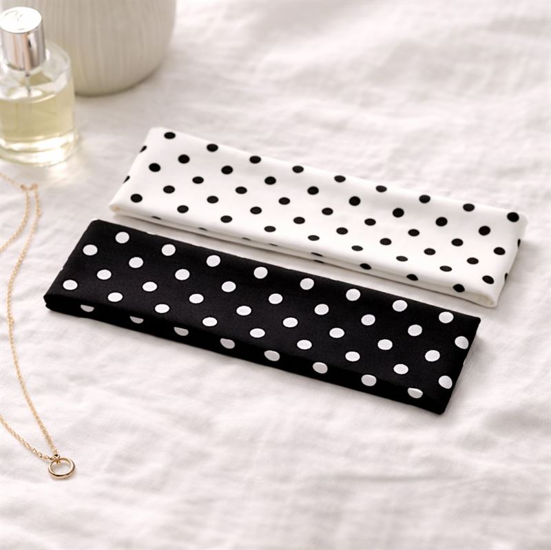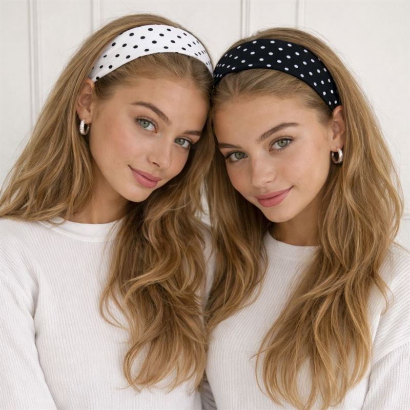 I settet får du ett hvitt hårbånd med svarte prikker og ett svart hårbånd med hvite prikker, slik at du enkelt kan variere looken din etter antrekk, humør og anledning. Bruk dem til løst hår, hestehale, knute eller half-up-frisyrer når du ønsker en enkel styling med litt ekstra personlighet.