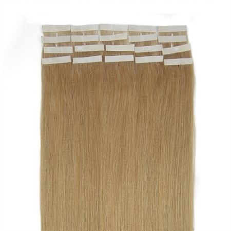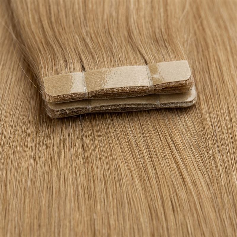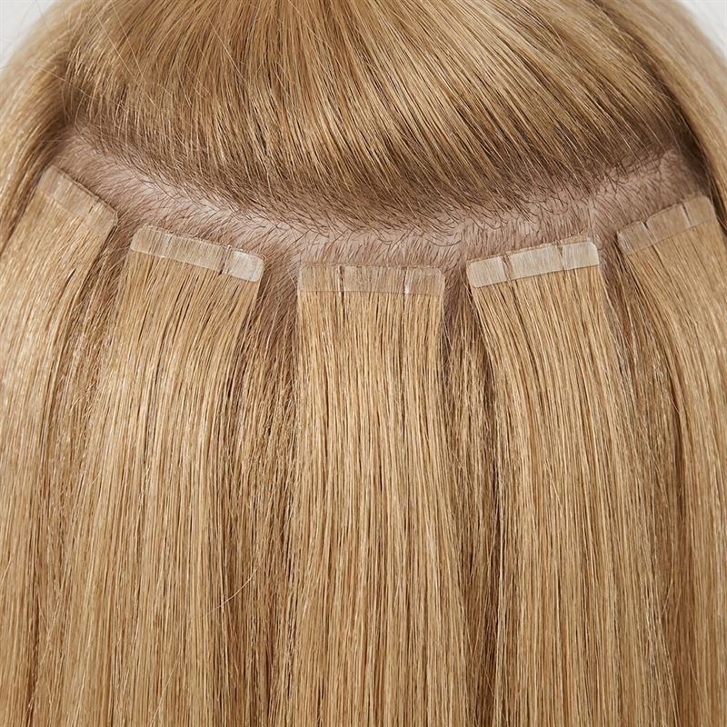 Disse Tape Extensions i 60 cm lengde og fargen mellomblond #27 er laget av 100% ekte Remy-hår, designet for å gi deg fyldig og langt hår med en naturlig og sømløs overgang.