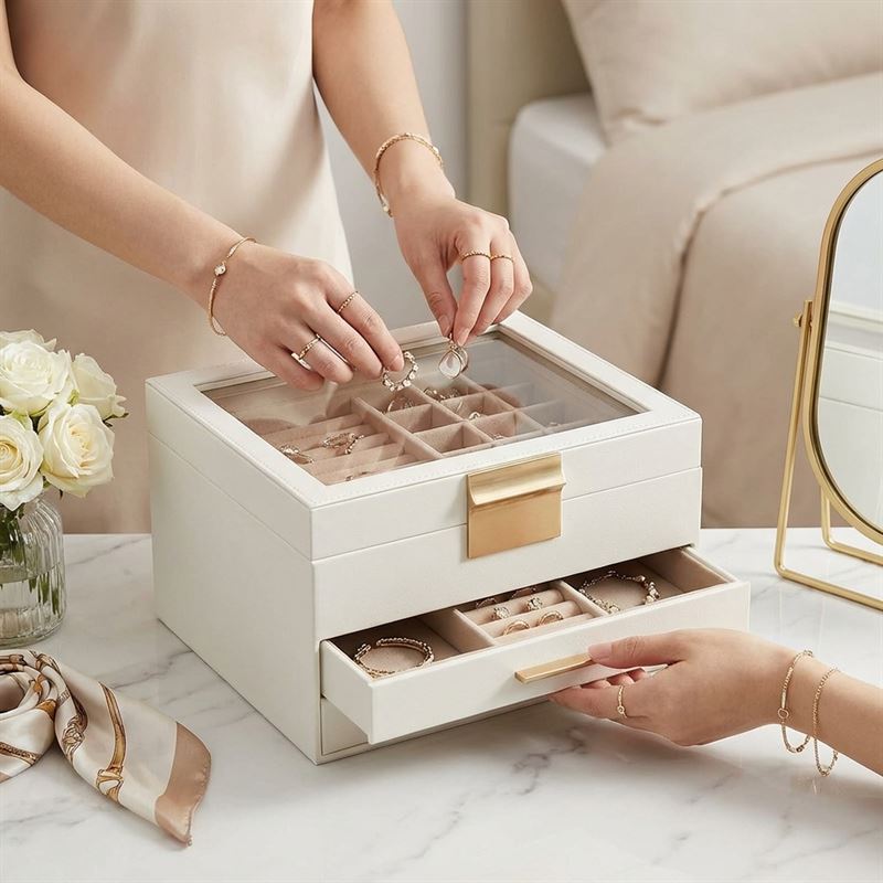 • Glasslokk med oversikt Beskytter mot støv og gjør det enkelt å se smykkene med en gang.
